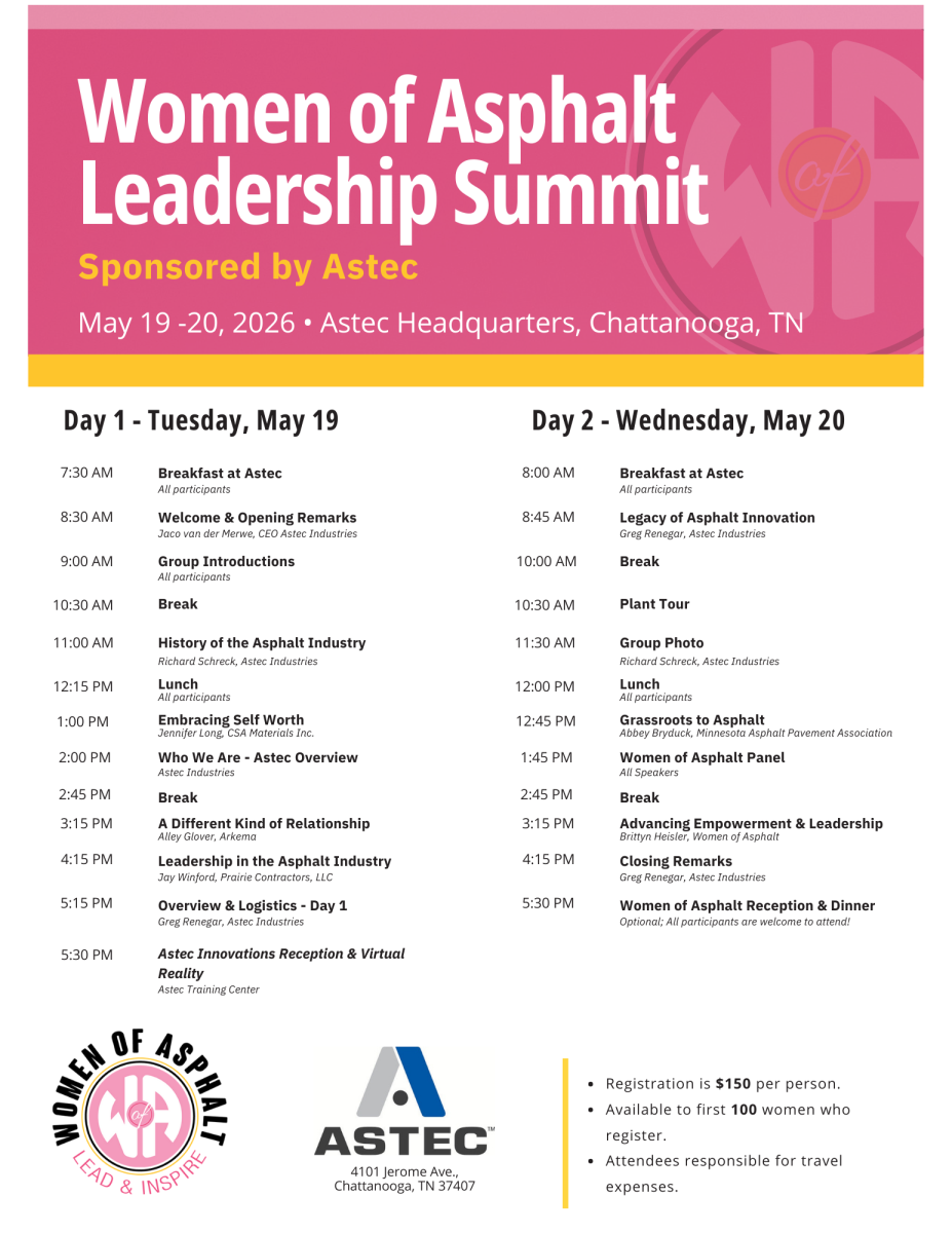 Join us for the WofA x Astec Leadership Summit, a two-day seminar designed to inspire, educate, and empower women across the asphalt industry.