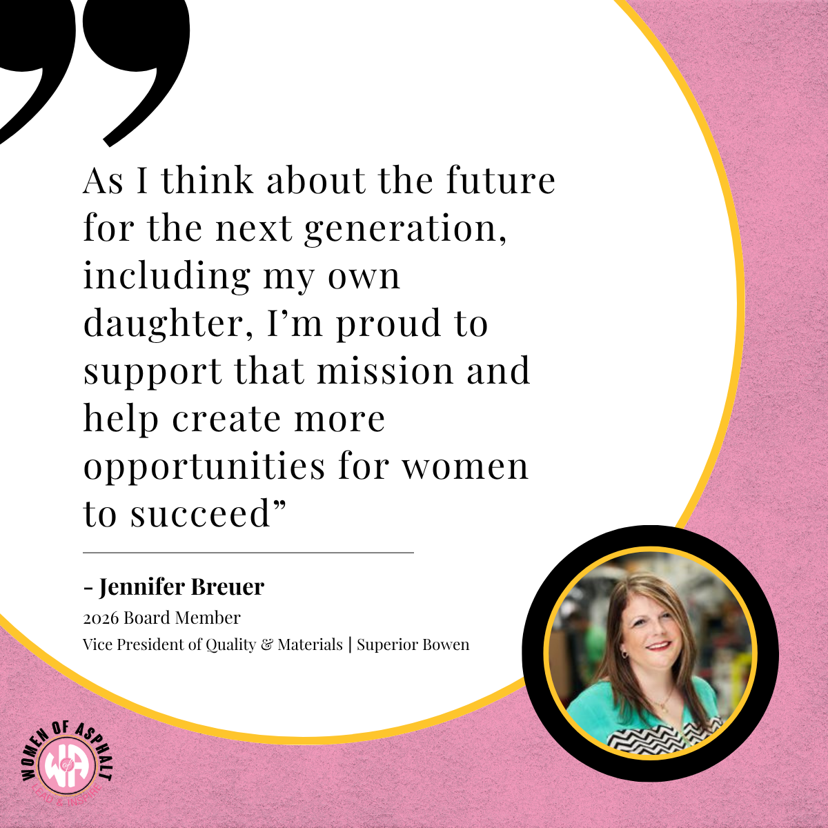 “Jennifer’s leadership, industry experience, and dedication to advancing women in asphalt make her an incredible addition to our Board,” said Rachel Quam, 2026 Women of Asphalt Board President. “We’re excited to have her perspective and energy helping guide the future of our organization.”