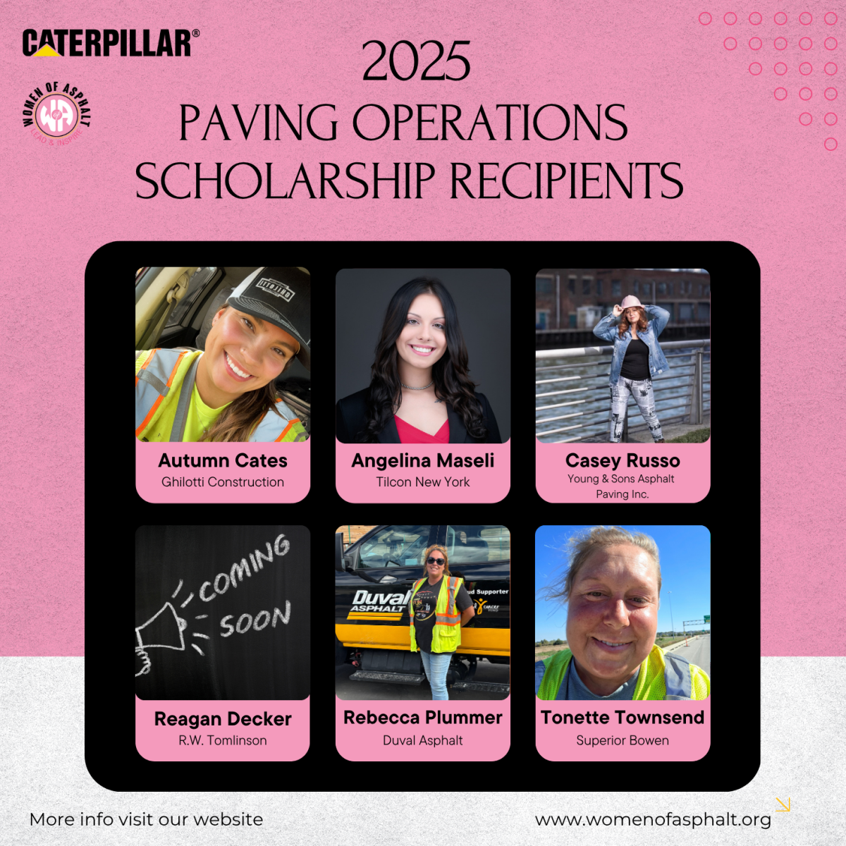 Launched in August, the second annual WofA x Caterpillar Paving Operations Scholarship continues to grow! After receiving 120 applications in just three weeks, we’re thrilled to announce six recipients of the 2025 scholarship.